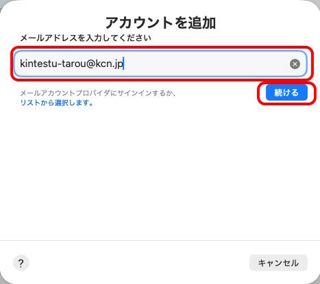 電子メールアドレスを入力 例)kintetsu-tarou@kcn.jp |