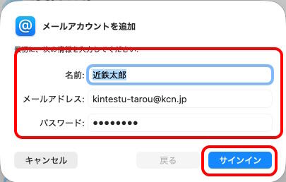 | メールアドレス | 電子メールアドレスを入力 例) kintetsu-tarou@kcn.jp |