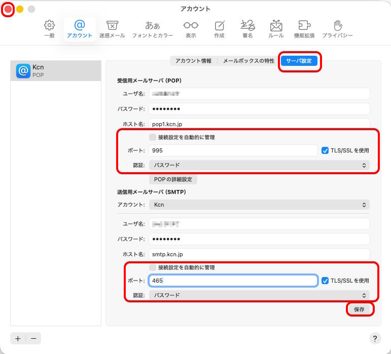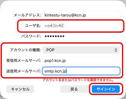 | 受信メールサーバ | 受信メールサーバ(POP3/IMAP) 例) pop1.kcn.jp |