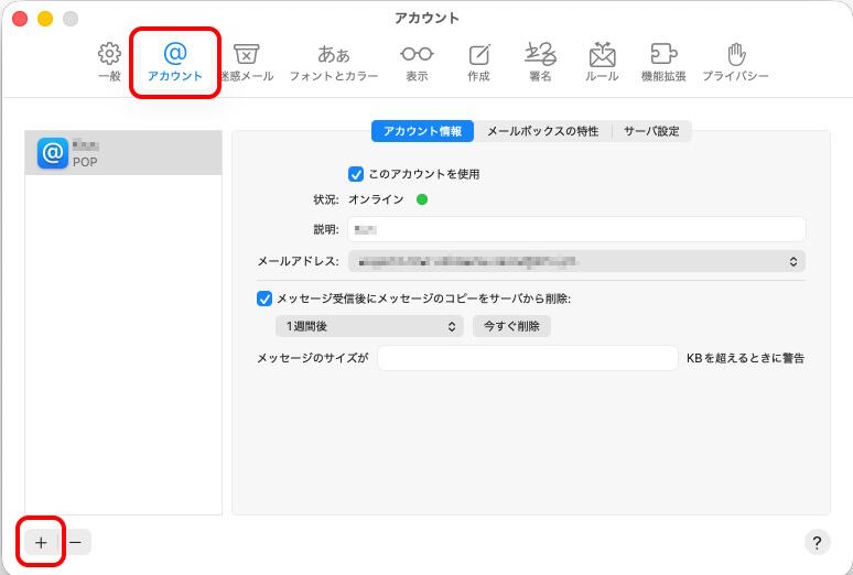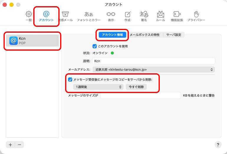 ※Macの場合、こちらの設定をしてもサーバからメールが削除されない場合があります。