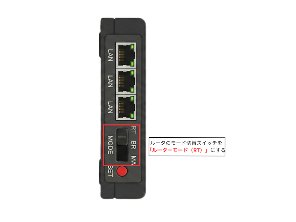 ルータのモード切替スイッチを「ルーターモード(RT)」に設定してください。