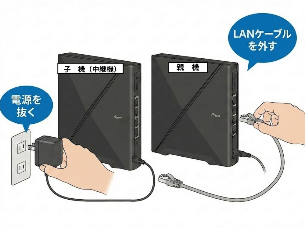 子機の電源を抜き、親機とのLANケーブルを外します。