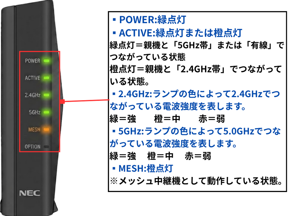 子機の「2.4GHz」または「5GHz」ランプの色で、親機からの電波がしっかり届いているか確認できます。