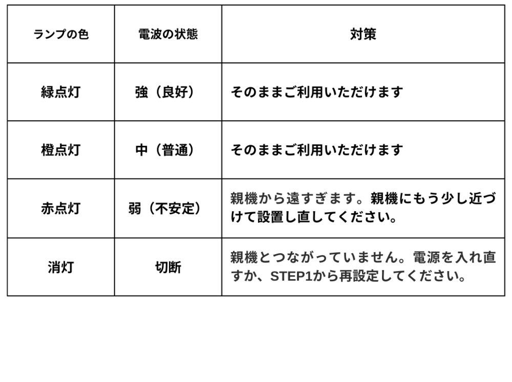 子機のランプの色を見て、置き場所を調整します。