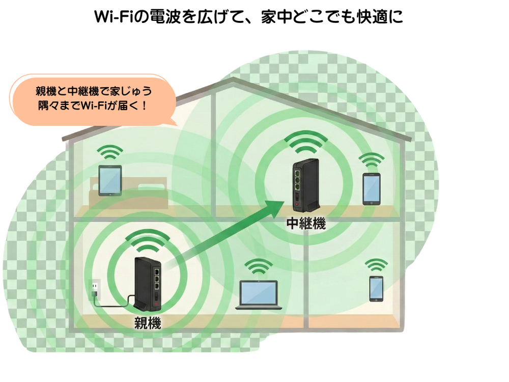 ご自宅で「Wi-Fiが遅い」「つながらない部屋がある」といった場合、中継器(または中継機能付きルータ)を追加することで、通信エリアを広げることができます。