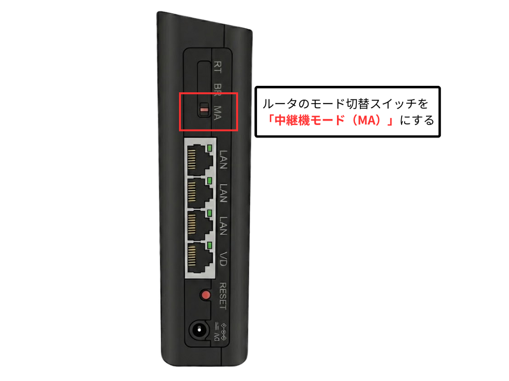 子機側のルータモード切替スイッチを「中継機モード(MA)」に設定します。