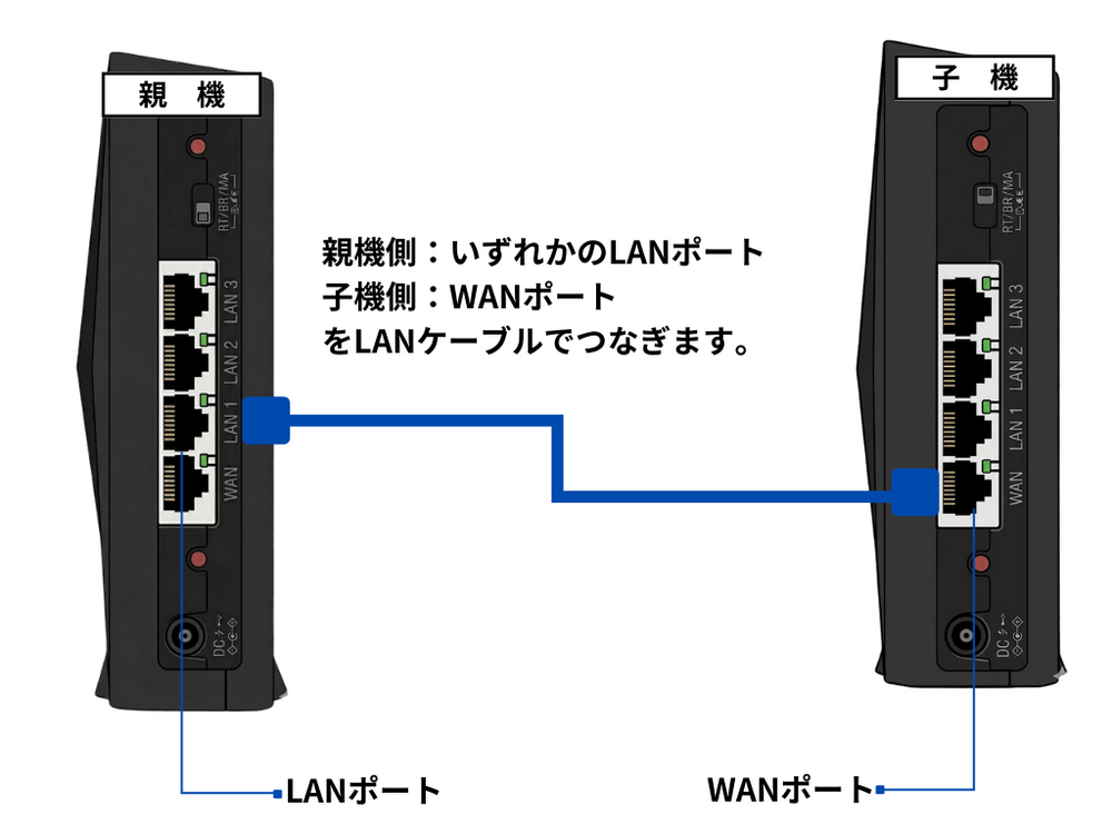 設定を失敗しないために、最初は2台を近くに置いて、LANケーブルでつないで設定してから、好きな部屋へ移動させます。