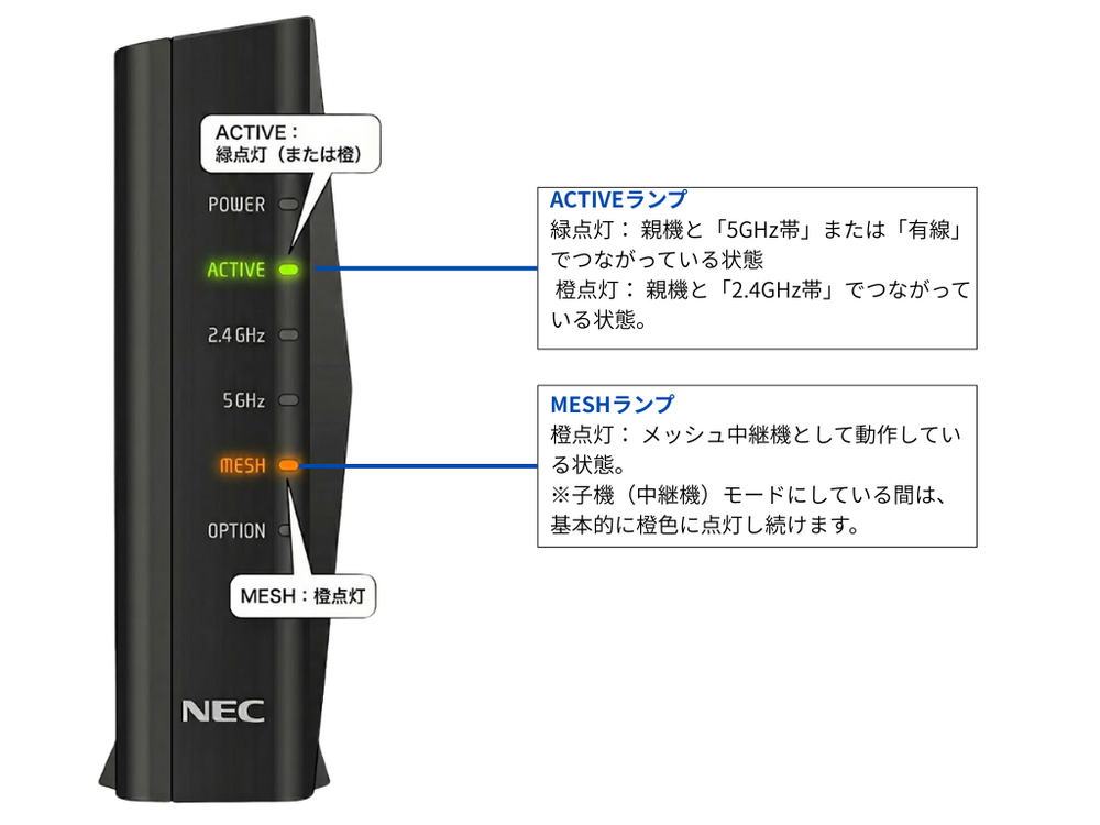 子機の「ACTIVE」ランプが緑色(または橙色)に点灯し、「MESH」ランプが橙色に点灯したら登録完了です。