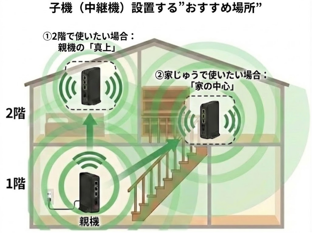 「家の中心」に近い場所に置くと、各部屋へバランスよく電波を広げられます。