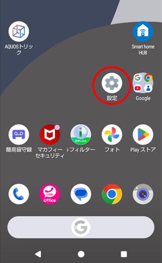 ホーム画面にある歯車マーク(=設定)をタップする。