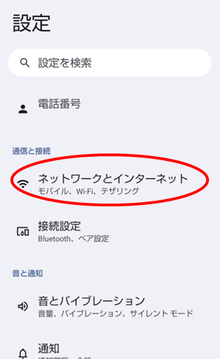 「ネットワークとインターネット」または「Wi-Fi」をタップする。