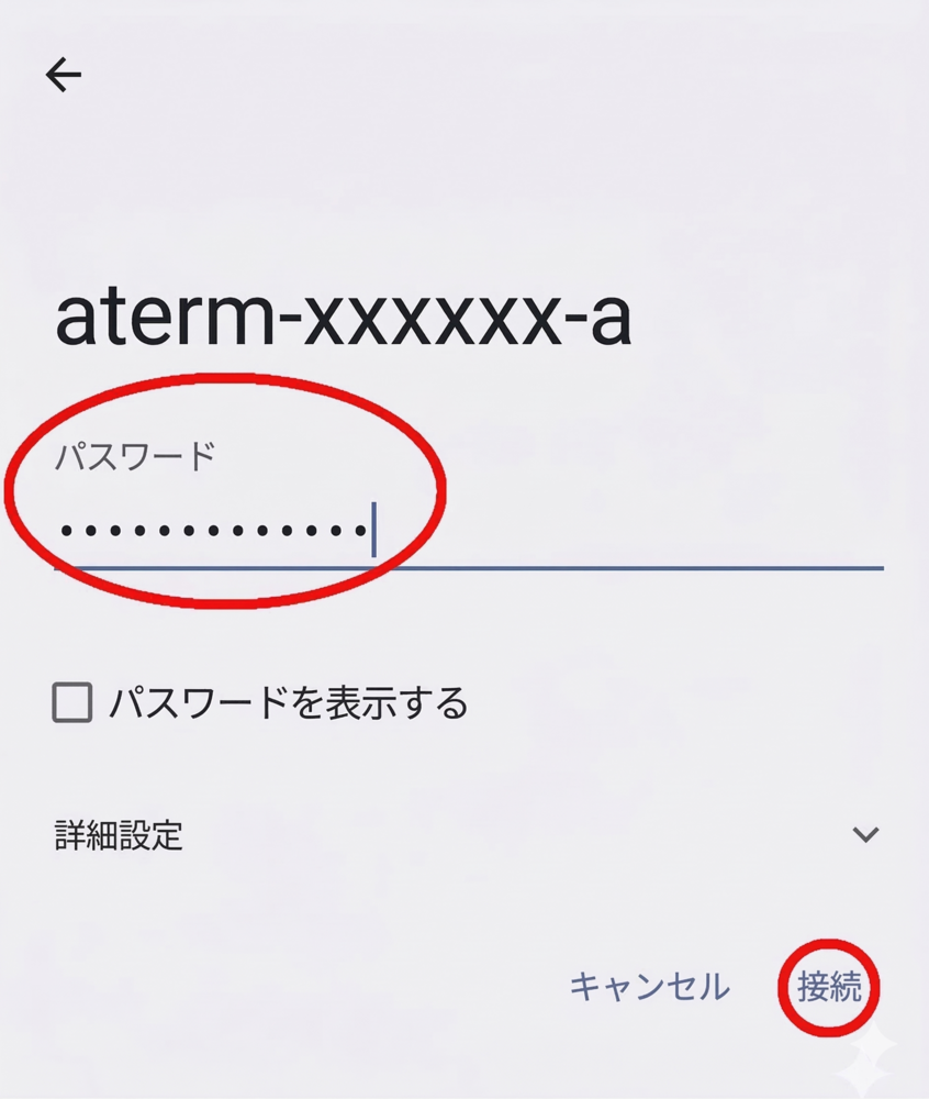 メモまたは撮影したものを確認し記載のある「パスワード(=暗号化キー)」を間違いないように入力し、「接続」をタップする。