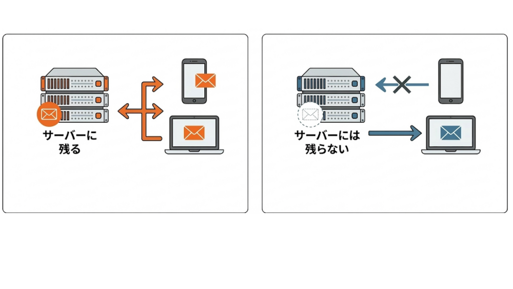 IMAP:インターネット上のメールボックスにメールを置いたまま、スマートフォンやパソコンから直接参照する仕組みです。
