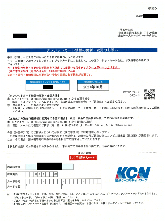 「クレジットカード情報更新・変更のお願い」の書面に記載の期日までに更新をお願いいたします。