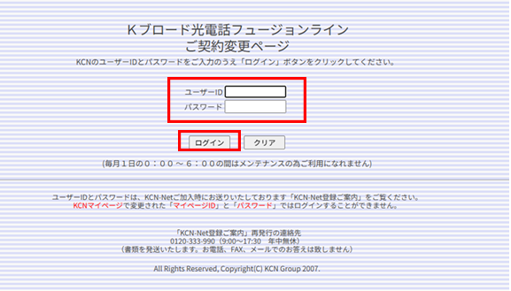 「Kブロード光電話フュージョンライン光電話ご契約変更ページ」にログインする。