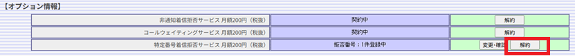 【STEP2】特定番号着信拒否サービスの「解約」をクリックする。