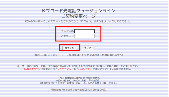 【STEP1】「Kブロード光電話フュージョンライン光電話ご契約変更ページ」にログインする。