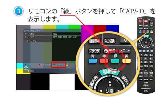 ③リモコンの「緑」ボタンを押して「CATV-ID」を表示します。