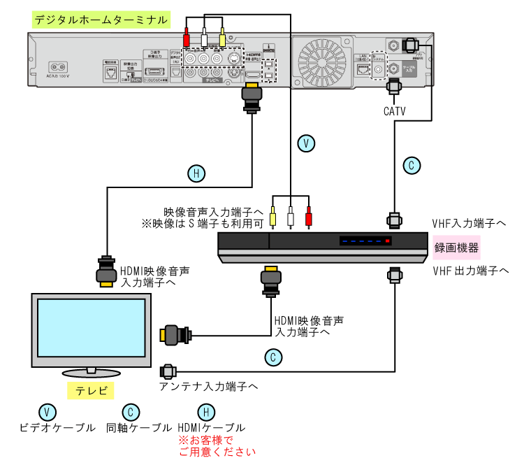 ご注意ください! デジタルホームターミナルで受信したハイビジョン番組をハイビジョン画質で録画するためには、HDD内蔵デジタルホームターミナル(楽見録)で録画いただくか、i-LINK(TS)端子搭載デジタルホームターミナルとD-VHSおよび一部のパナソニック製ハイビジョンレコーダーとi-LINK (TS)接続する必要があります。(対応機種については パナソニックHPをご覧ください )なお、iLINK(TS)接続につきましては、お客様側で接続・設定していただきますようお願いします。