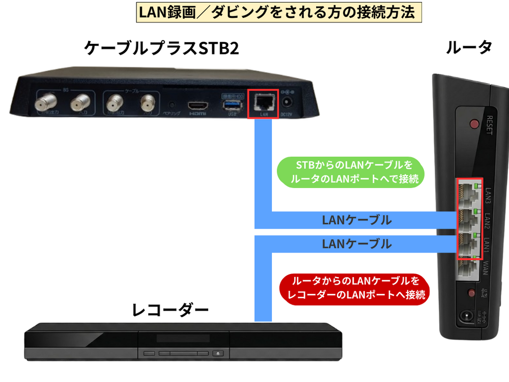 ※必ず有線接続のみとなります。STBと録画機を両方ともルーターに直接LANケーブルでつないでください。