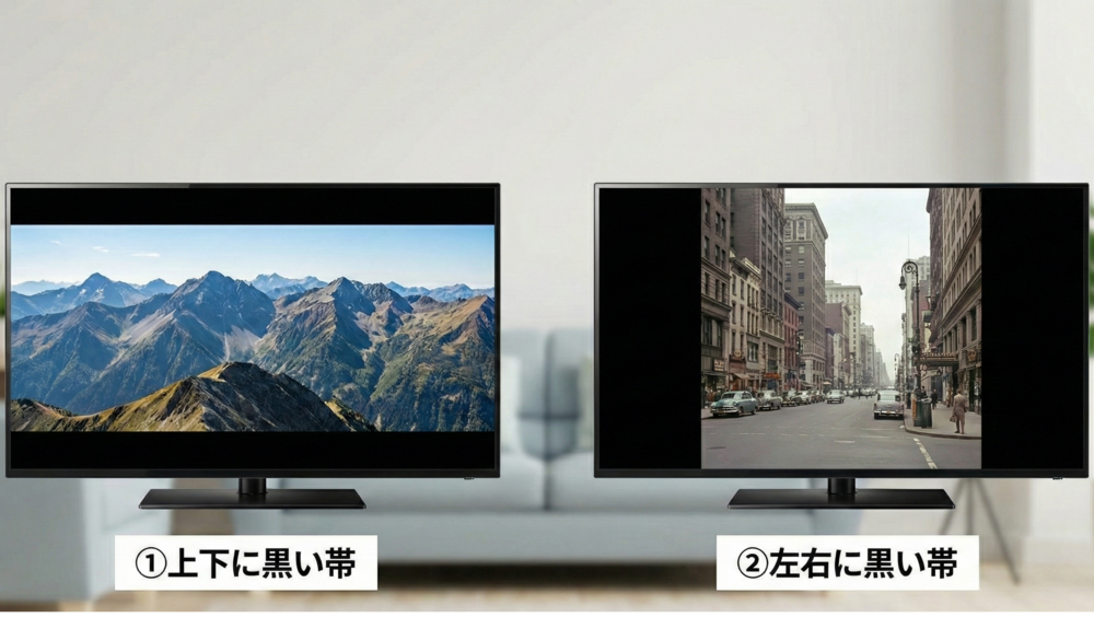 映画など横に長い「シネマスコープサイズ」の映像は、仕様で上下に黒い帯が入る場合があります。