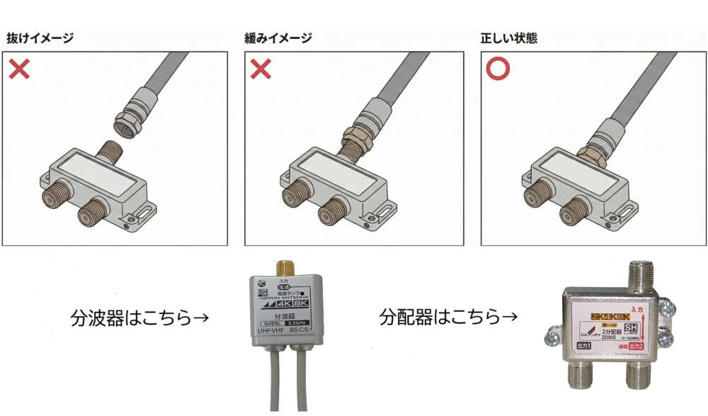 分波器/分配器の同軸ケーブルの抜け・緩み確認