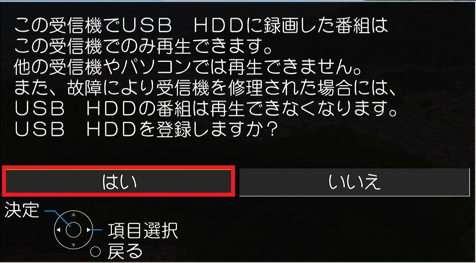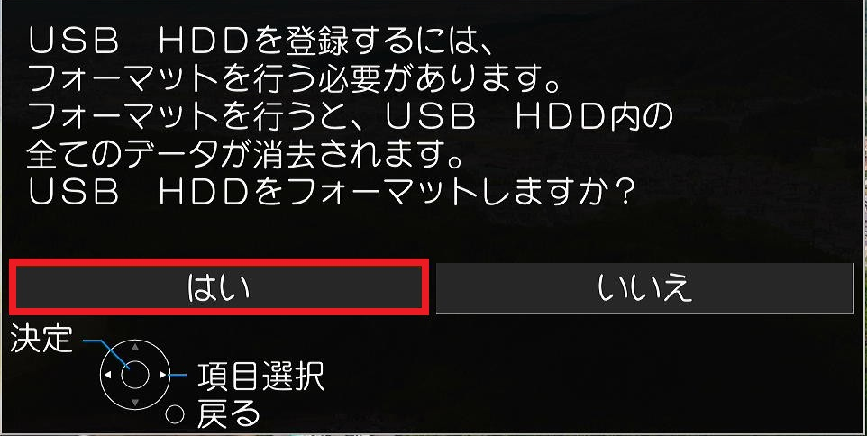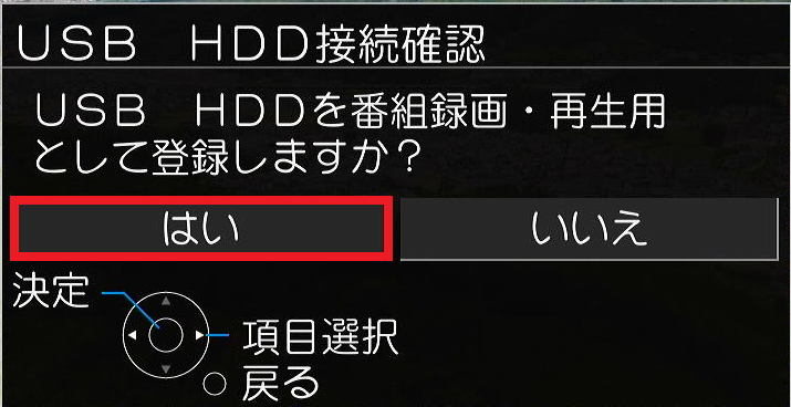接続後『USB HDD接続確認』が表示され、『はい』を選択し決定ボタンを押す。