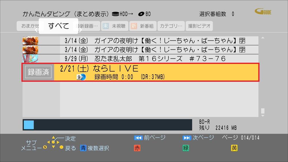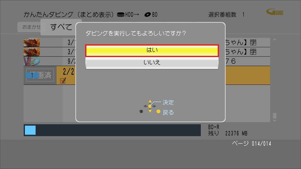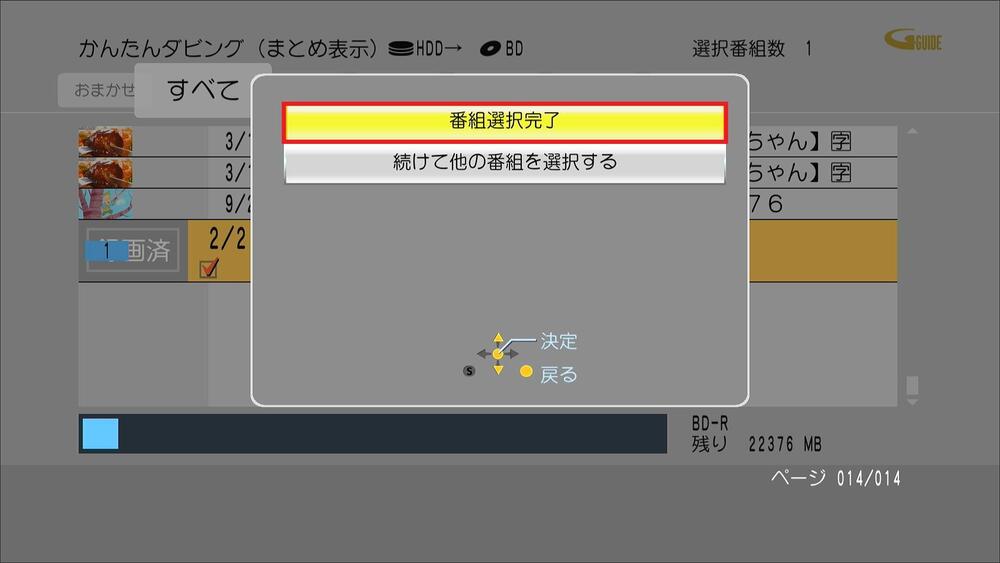 録画一覧が表示され、ダビングしたい番組を選択し決定ボタンを押す。