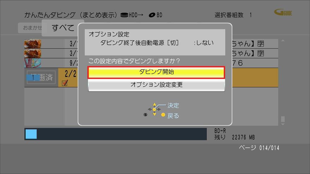 『ダビング開始』を選択し決定ボタンを押す。