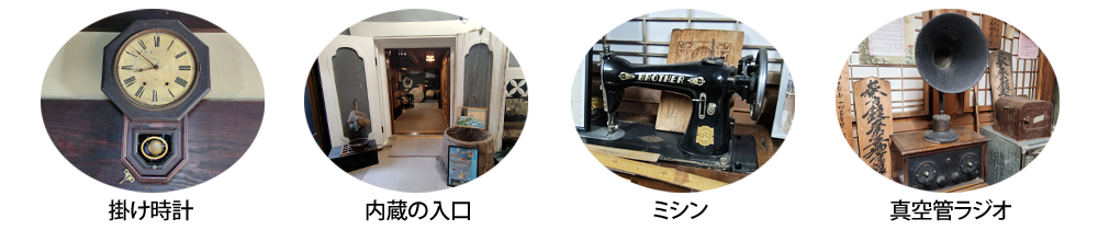 長い年月、手つかずのまま残されてきた家の中には、当時使用されていた生活用具も数多く保存されていました。母屋にある柱時計は、アメリカで最も古い時計メーカー「セス・トーマス社」で約160年前に作られた物で、今でもネジを巻けば動くそうです。母屋奥の重厚な扉の内蔵には、昔のブラザーのミシンや真空管ラジオ、氷を入れて使う冷蔵庫などが所狭しと並べられています。まだ展示しきれていない品も多く、時期によって展示品を変えているとのことなので、今後も新しいお宝に出会えるのが楽しみです。