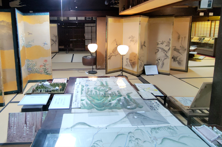 約200坪ある建物内は、見取り図案内を見ながら自由に見学ができます。質商、両替商、薬種商などの商家であった藤岡家で使用されていた商売道具や調度品が置かれ、欄間、襖絵、建具にいたるまで見どころがたくさんあります。また、文人であった玉骨氏は、与謝野鉄幹・晶子夫妻をはじめとした文化人との交流が深く、何気なく飾られている書が森鴎外直筆の物(写真左下)であったり、高浜虚子の色紙(写真右下)が展示されていたり、一流の文化人の名前にも驚かされます。 sanpo_fujiokakenaka_300.png