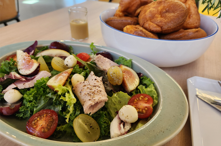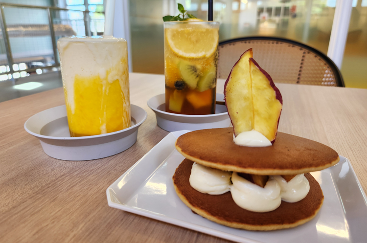 施設内のカフェでいただいたランチも魅力的でした。「季節果実と自家製ローストポークのサラダプレート」は野菜たっぷりで、自家製のドレッシングの酸味と旬の果物の甘さが絶妙にマッチ。おかわり自由のポップオーバーにサンドして食べるのもおすすめです。「焼き野菜と果実のカレー」は奈良県産のお米と果実の甘みを引き立てるスパイスで、スプーンが止まりません。デザートやドリンクも充実。「溢れんばかりのフルーツをどうぞ!」をコンセプトにしたスムージーは、受け皿に溢れるほどたっぷり。フルーツティーソーダや地元さつまいもを使ったどら焼きも楽しめます。五條の恵みを現地で味わってみてください。