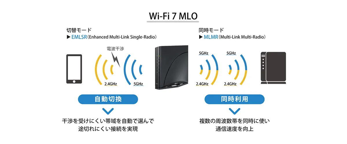 Wi-Fi 7のMLO(Multi-Link Operation)技術により、複数の周波数帯の切り替えや同時利用ができるようになりました。切替モードで干渉を回避して安定通信を維持し、同時モードは2つの帯域を同時利用して通信速度を向上させます。