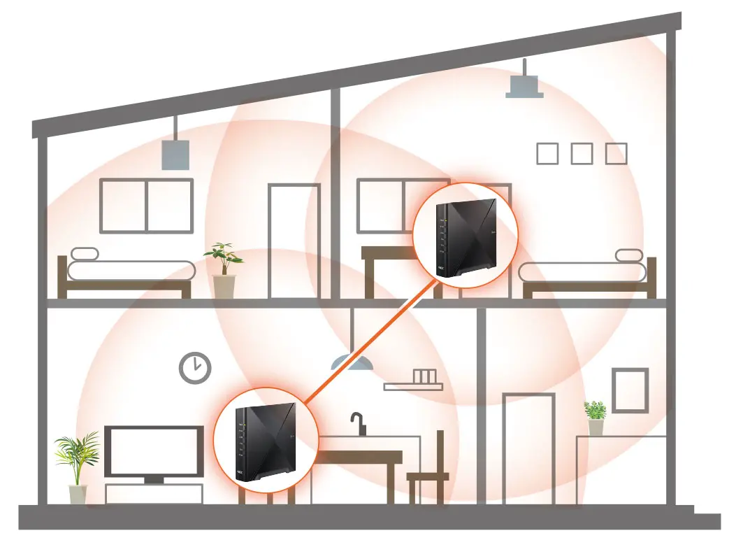 メッシュ状にネットワークを広げていくことで、大きな家や間取りが複雑な家でも、快適な通信環境が整います。